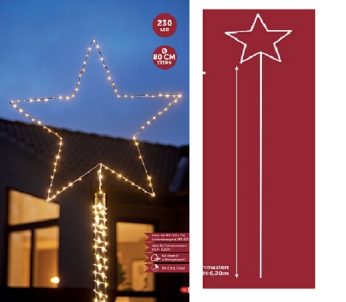 W Metallstern für Fahnenmast 230 LED Ø 80 cmStern mit 90 LED + inkl. 7 Meter Lichterstrang mit 140 LED